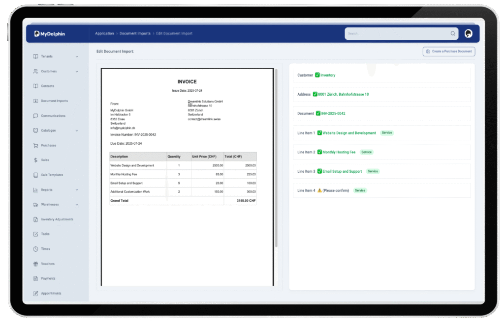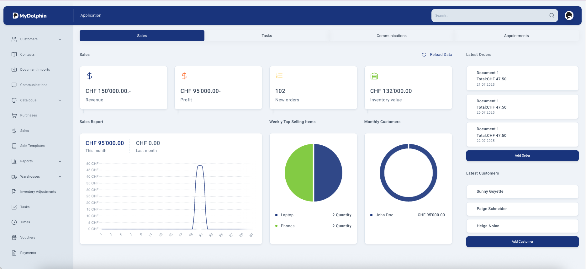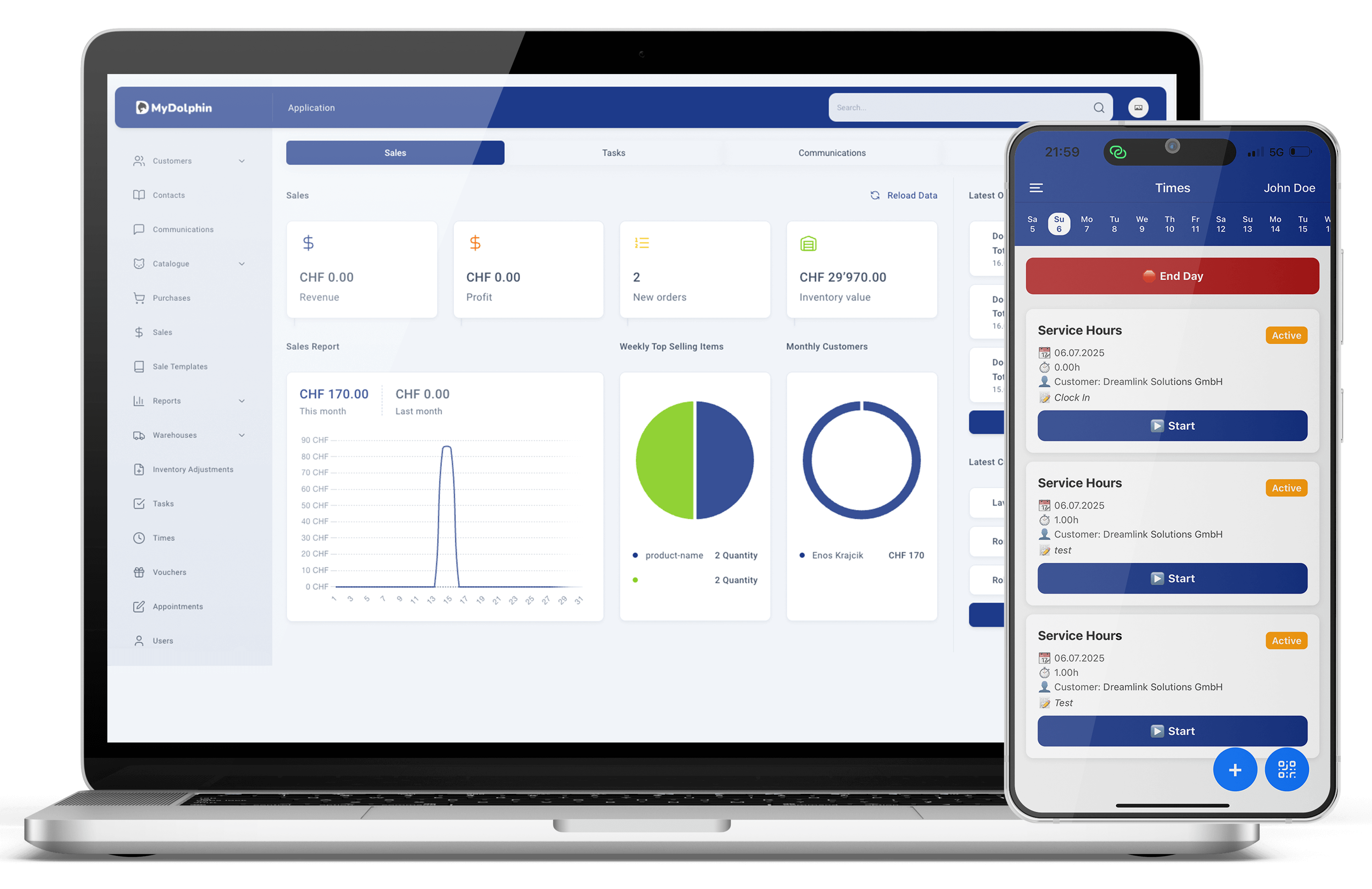 Verwalten Sie Angebote, Aufträge und Rechnungen effizient in einem durchgängigen Workflow. Mit Echtzeit-Einblicken und Kundenverfolgung vereinfacht MyDolphin Ihren gesamten Verkaufsprozess – von der Anfrage bis zur Zahlung.